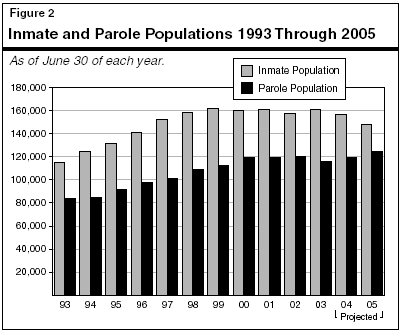 Inmate Population Decrease. As of June 30, 2003, the CDC housed 160,931 inmates in prisons, fire and conservation camps, and community correctional facilities. The CDC projects the inmate population to decline to 148,390 by June 30, 2005, a decrease of over 12,000 inmates. This projected decline by mid-2005 is primarily the result of a series of policy reforms enacted as part of the 2003-04 Budget Act, which includes programs to restructure parole, inmate education, and substance abuse treatment. (See The "New Parole Model" later in this chapter.) In the absence of these reforms, the inmate population would have increased to over 163,000 inmates because of a recent trend of moderately increasing new admissions to prison. Under the policy reforms, the prison population is projected to decline to its mid-1990s levels, creating the first substantial drop in the state's inmate population in at least 20 years. Figure 2 shows the year-end inmate and parole populations for the period 1993 through 2005.