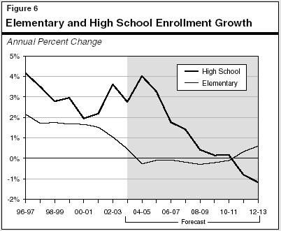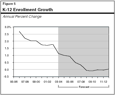K-12 Enrollment Growth to Slow Significantly. K-12 enrollment is projected to increase by about 1 percent in 2004-05, bringing total enrollment to about 6.3 million students. Figure 5 shows how enrollment growth has slowed since 1996-97. Over the next ten years, K-12 enrollment growth will continue to slow and actually decline beginning in 2008-09. This contrasts with growth averaging 2.2 percent annually during the 1990s.