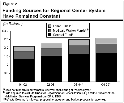 Overall Spending and Cost Per Client Growing. Despite recent legislative initiatives to control costs, which we discuss in more detail below, General Fund spending (again, after adjusting for a program shift to DDS) has increased by $332 million or by 25 percent since 2001-02. As shown in Figure 2, while the overall level of RC spending has increased, the proportion of RC support coming from the General Fund has remained fairly stable in recent years. The proportion of RC funding coming from the federal Medicaid waiver has also remained steady over time.