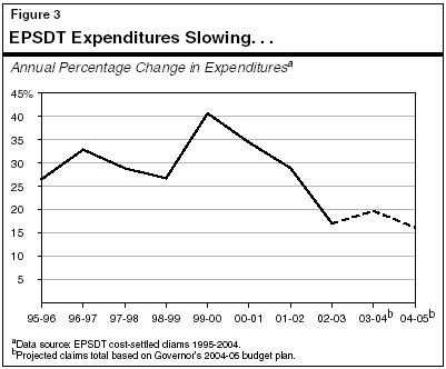 Additionally, the 2004-05 budget reflects a change in the share of costs of the Medi-Cal Program that is supported by the federal government. In 2003-04, a congressional fiscal relief package for the states bumped up the share of costs borne by the federal government for Medicaid. This had the effect of reducing the state cost of EPSDT services in the current year. However, the federal relief package is scheduled to expire at the end of 2003-04. The Governor's budget plan takes into account that the state share of EPSDT program costs will increase in 2004-05 from the current 50 percent to 53.3 percent. This also has the effect of inflating the 2004-05 spending level for EPSDT services.