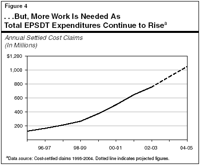 Slowing of Expenditures Suggests Progress, but More Effort Needed. Our analysis indicates that the existing cost containment measures have curbed some of the EPSDT expenditure growth. As can be seen in Figure 3, the rate of growth of state expenditures for EPSDT peaked several years ago and has since begun to decline. This decline suggests that the state is making some progress at containing EPSDT expenditures. However, the total cost of the program continues to grow, as can be seen in Figure 4. Under the Governor's 2004-05 budget proposal, total spending for EPSDT services would surpass $1 billion once all funding sources for the program have been taken into account.