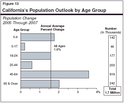 The age-related characteristics of California's population growth are especially important from a budgetary perspective, given their implications for such program areas as education, health care, and social services. Figure 13 shows our forecasts for both the percentage and numeric changes in different population groups. The 45-to-64 age group (baby boomers) continues to be the fastest growing segment of the population. About 919,000 new people are expected to move into this age category over the next three years, as the tail end of the baby-boom generation moves into its mid-40s.