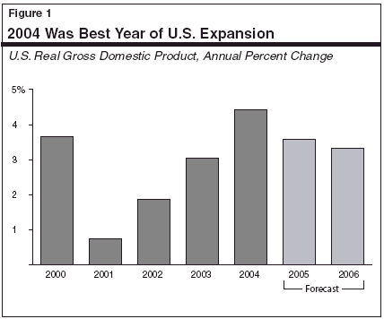 Both the U.S. and California economies grew at a solid pace in 2004. As shown in Figure , U.S. real gross domestic product (GDP) expanded by 4.4 percent, the largest gain since 1999. Employment grew modestly despite continued cost-cutting and merger activity by businesses. Prices for oil and raw materials jumped during the year, but overall inflation accelerated only modestly. Looking ahead, we expect economic growth at both the nation and in California to slow some, but continue at moderate pace through the forecast period.