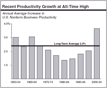 What Is Behind Recent Strong Productivity Increases? One of the more significant developments over the past decade has been the acceleration in productivity (defined as output per hour worked in the economy). Over the long term, productivity growth is a key determinate of output and income in the economy�with strong productivity translating into rising wealth and living standards. In recent years, high productivity growth contributed to low prices and strong profit growth. On the other hand, it has also been cited as a factor behind the lack of job growth, since businesses have been able to expand production without adding workers. Given these developments, future productivity growth has implications for inflation, job growth, and output growth in the years ahead. Historical Perspective. As shown in the accompanying figure, nonfarm business productivity in the U.S. economy has increased at an average annual pace of 2.3 percent during the past 55 years. The growth rate exceeded that average during much of the 1950s and 1960s, then fell below the average in the 1970s and early 1980s�an era when the economy was absorbing many younger and less experienced workers�before partially recovering in the 1980s and early 1990s. In the second half of the 1990s, the average rate accelerated again�to 2 percent per year in 1995-1999 period and to 3.6 percent during the past five years.