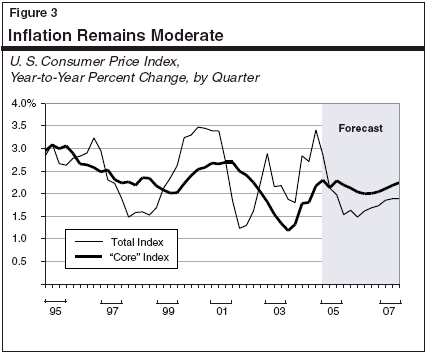 Inflation accelerated significantly in 2004, but the increase was relatively mild in view of the dramatic jump that occurred in energy and raw material prices. As indicated in Figure 3, growth in the U.S. consumer price index (CPI) rose from 1.8 percent in the first quarter of 2004 to 3.4 percent by the final quarter of the year. Much of the increase, though, was concentrated in the energy-related components. The CPI excluding the volatile food and energy categories (which is often referred to as the "core rate" of inflation) rose much more modestly during the year�from 1.3 percent to only 2.2 percent. The rapid growth in energy-related prices was largely absorbed by businesses and not "passed along" to customers in the form of higher prices. The lack of more widespread price increases was a welcome development. Higher inflation would have quickly translated into higher short- and long-term interest rates, which would have had damaging effects on housing and other sectors of the economy.