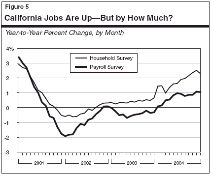 A basic question related to California's economic picture is: Exactly how strong is employment growth? As shown in Figure 5, two surveys of employment are providing decidedly different pictures of employment strength in this state. Specifically: