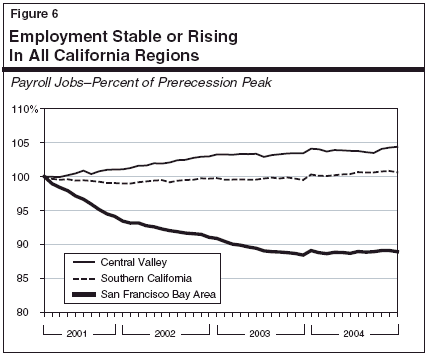 California's job downturn during 2001 through mid-2003 was concentrated in the Bay Area. As shown in Figure 6, that region lost nearly 12 percent of its job base between 2001 and mid-2003, reflecting major declines in the high-tech industry. In contrast, job losses in Southern California were mild and the Central Valley continued to grow during the period. As Figure 6 indicates, the overall improvement in California's job picture is largely the result of (1) continued steady, albeit slow, growth in Southern California and the Central Valley and (2) the stabilization in the Bay Area's job market.
