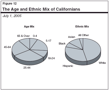 The implications of demographic trends for the budget depend not only on the total number of Californians, but also on their characteristics. California is well known for having one of the world's most dynamic and diverse populations, including an increasingly rich ethnic mix and a large number of in-migrants. The state's age and ethnic mix is shown in Figure 12.