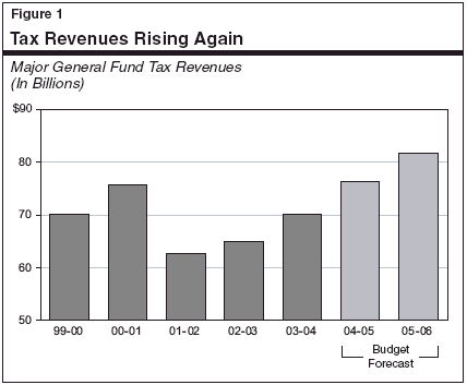 After falling sharply early in the decade, revenues are on the rise once again (see Figure 1). The administration assumes that General Fund tax receipts will increase by 8.7 percent in the current year and by 7 percent in 2005-06. These gains are indicative of a healthy expansion in profits, sales, and personal income in California. In this Part, we provide background information relating to the revenue outlook, discuss recent revenue developments, summarize the budget's revenue projections, and present our own revenue forecast.