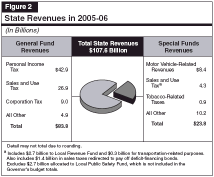 The 2005-06 Governor's Budget projects that California's state government will receive nearly $107.6 billion in revenues during the budget year, a 7.3 percent increase from the current year. These revenues are deposited into either the General Fund or a variety of special funds. Figure 2 shows that: