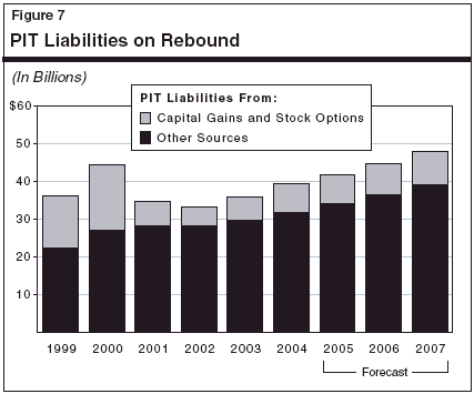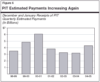 The key determinant of CT receipts is the strength of corporate profits reported on California tax returns by businesses. After falling in 2001 and most of 2002, California earnings rebounded in 2003 and then soared by over 20 percent in 2004 (see Figure 10). The recent boom reflects both intensive cost-cutting efforts by businesses throughout the economy, as well as a sharp rebound in sales and output last year. Profit growth was widespread, encompassing manufacturing, trade, services, real estate, and financial industries. The surge in oil prices also boosted earnings of refiners in the state.