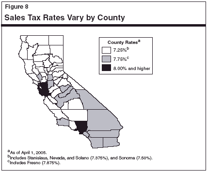 Combined SUT Rates. The combined state and local SUT rate varies significantly across California due to differences in the local optional rates that are levied (see Figure 8). The combined SUT rate currently ranges from 7.25 percent (for those counties with no optional rates) up to 8.75 percent (for Alameda County and the City of Avalon in Los Angeles County).