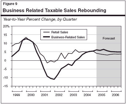 Outlook—More Moderate Growth in 2005 and 2006. Looking ahead, we believe that total taxable sales growth will moderate to 5.7 percent in 2005 and further to 5.4 percent in 2006. The main reason for the slowdown is our expectation that—like the rest of the nation—household spending in California will ease some due to high consumer debt levels and rising interest rates. In contrast, we expect business spending to continue at a solid pace during the next couple of years.
