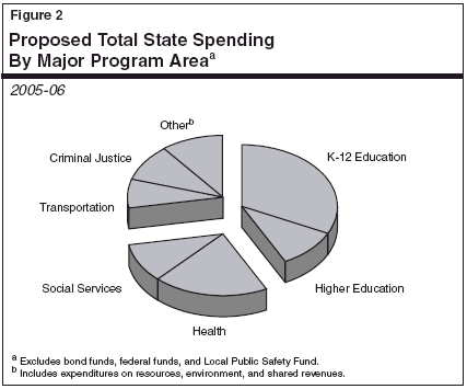 Figure 2 shows the allocation of the proposed $109 billion of total state spending in 2005-06 among the state's major program areas. Both General Fund and special funds expenditures are included in order to provide a meaningful comparison of state support among broad program categories, since special funds provide the bulk of support in some areas (such as transportation).
