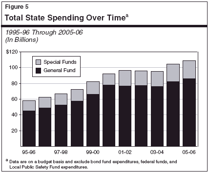 Total Spending. Figure 5 shows that total state spending increased by 25 percent between 1995-96 and 1998-99, and then jumped by another 33 percent between 1998-99 and 2001-02. In contrast, spending has been relatively flat since 2001-02. Over the full ten-year period, total spending is up $51 billion (88 percent), for an average annual growth rate of 6.5 percent.