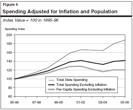 Real Per-Capita Spending. Figure 6 shows total state spending adjusted for inflation and population. It indicates that:
