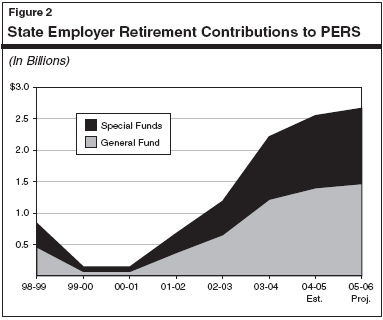 Down, Then Up�When Agency Budgets Could Ill Afford It. After a series of double-digit investment returns in the late 1990s greatly improved plan funding, employer contributions dropped substantially. In addition, the state and local governments increased benefits, which used up surplus assets and increased the annual normal cost. When the stock market declined, plans experienced consecutive years of less-than-expected investment returns. This double whammy�higher benefit costs and major asset losses�led to hefty increases in employer contribution rates. For example, Figure 2 shows how state contributions went from almost nothing at the start of the decade to over $2.5 billion just four years later. These cost increases came at a time of operating budget shortfalls for the state and many local jurisdictions�forcing additional programmatic reductions or revenue increases elsewhere in their budgets.
