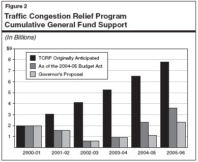SummaryTransportation funding has been limited and uncertain in recent years. The Governor's budget proposals for 2005-06 would further restrict transportation funding and increase uncertainty in the near term. The budget proposes to use $1.5 billion in transportation funding to aid the General Fund. It also changes the repayment conditions for several outstanding transportation loans, thereby reducing the General Fund's commitment to repay transportation in the near term. These proposals would particularly affect the Traffic Congestion Relief Program (TCRP). We recommend that the administration provide information to the Legislature that would allow it to determine (1) the effect of the Governor's proposals on the size of the transportation program and (2) TCRP project funding requirements in 2005-06. The administration also proposes changing the State Constitution to protect transportation funding in the long run by preventing future suspensions of Proposition 42. This would increase transportation funding stability at the expense of the General Fund, although transportation funding uncertainties would remain. We have previously recommended a means for stabilizing transportation funding without affecting the General Fund.