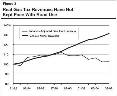 Gas Tax Has Lost Value as Travel Has Increased. The number of miles driven on California roads has steadily increased over the past decade. As Figure 3 indicates, vehicle-miles traveled on all California roads increased 20 percent between 1991-92 and 2001-02. This trend is projected to accelerate through the budget year, with vehicle-miles traveled expected to be over 30 percent higher in 2005-06 than in 1991-92. However, revenue from the state's primary transportation fund source�namely, the excise tax on gasoline and diesel fuel�has not kept pace with this trend. Figure 3 shows that revenues from this tax roughly kept pace with miles traveled throughout the 1990s, as the tax rate was gradually increased in that period from 9 cents to 18 cents per gallon. From 1998-99 through 2005-06, however, inflation-adjusted state gas tax revenues are projected to decline 8 percent while vehicle-miles traveled increase by more than 16 percent. The decline in the real value of the gas tax means that the costs of the things the gas tax is used to buy are increasing faster than the gas tax revenue. Thus, even though the state is nominally receiving more dollars from the gas tax each year, current revenue can buy fewer transportation projects than the revenue received in 1998-99.