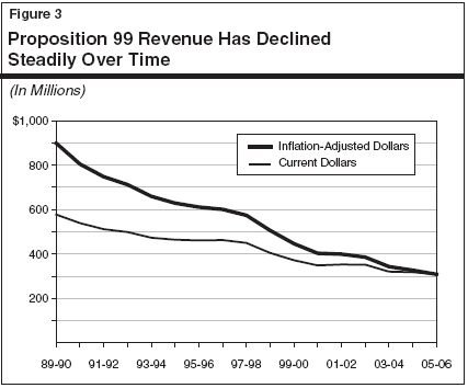 Proposition 99 Funds Have Declined Steadily. The tobacco-tax revenues generated under Proposition 99 have steadily declined since the measure's inception. As seen in Figure 3, the success of efforts to reduce smoking, and the imposition of further tax increases on cigarette products, have resulted in a 46 percent decline in Proposition 99 revenues�from the $573 million received in 1989-90 to an estimated $309 million in 2005-06. The impact of this decline is even more apparent when the value of the initial revenue generated by this measure is adjusted for the effects of inflation. As seen in Figure 3, Proposition 99 revenues, as adjusted for inflation, have dropped by 66 percent since 1989-90.