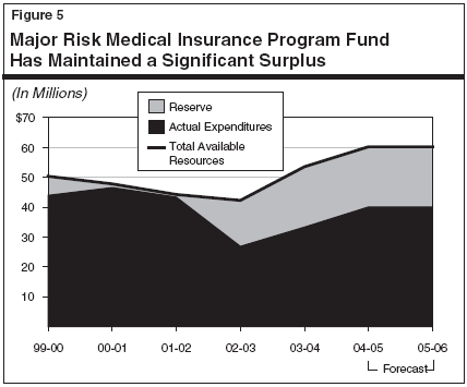 Governor's Budget Proposal. The Governor's 2005-06 budget plan includes the customary $40 million in Proposition 99 funding through the Major Risk Medical Insurance Fund for MRMIP. The budget plan also sets aside a reserve in the Major Risk Medical Insurance Fund to ensure the program has sufficient revenues to cover any unanticipated operating expenses. Under the 2005-06 budget plan, the reserve would total $20.2 million, an amount roughly equal to 50 percent of the program expenditures annually supported by the fund.