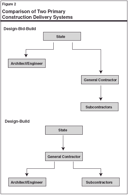 For most of the last century the state�like all sectors of government across the nation�accomplished construction work using a system called "design-bid-build." The state used this approach almost exclusively to build its roads and freeways, public buildings, correctional institutions, universities, hospitals, and water and natural resources infrastructure. Similarly, local governments have used mainly design-bid-build to construct public projects.