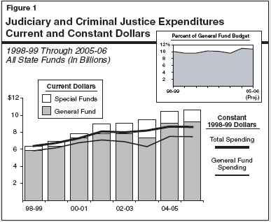 Historical Trend. Figure 1 shows expenditures from all state funds for judiciary and criminal justice programs since 1998-99. These expenditures have been reduced to reflect federal funds the state has or is expected to receive to offset the costs of incarceration and parole of undocumented `felons. The figure shows General Fund expenditures for judiciary and criminal justice programs are projected to increase by $3.4 billion between 1998-99 and 2005-06, an average annual increase of 6.8 percent. General Fund expenditures increased during this period mostly due to (1) the state's assumption of primary responsibility for funding trial court operations as a result of legislation enacted in 1997 and (2) increased labor costs to operate the state corrections system, as well as court-ordered expansions of inmate health and mental health services.