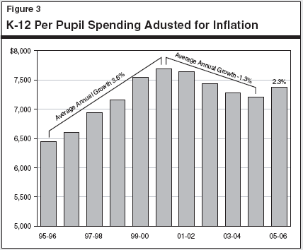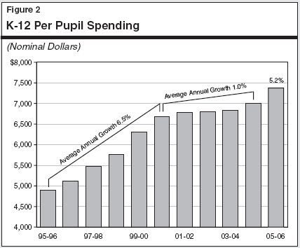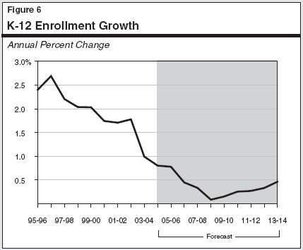 K-12 Enrollment Growth to Slow Significantly. K-12 enrollment is projected to increase by about 0.8 percent in 2005-06, bringing total enrollment to about 6.3 million students. Figure 6 shows how enrollment growth has steadily slowed since the mid-1990s. The figure also indicates that K-12 enrollment growth will continue to slow until 2008-09, when it will turn upward.