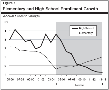Divergent Trends in Elementary and High School Enrollment. Figure 7 shows that the steady decline in K-12 enrollment growth masks two distinct trends in elementary (grades K-8) and high school (grades 9 through 12) enrollment. Elementary school enrollment growth has gradually slowed since 1995-96. This enrollment is expected to decline annually between 2004-05 and 2008-09. In contrast, high school enrollment growth has been growing rapidly, with a 3.6 percent increase in 2004-05. Beginning in the budget year, growth is expected to slow sharply, becoming negative in 2010-11. Expected growth from the current year to 2007-08 is approximately 115,000 pupils (6 percent). Between 2007-08 and 2013-14, however, enrollment will fall by almost 40,000 students.