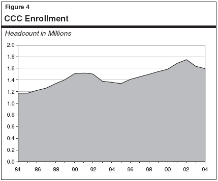 The CCC is the nation's largest system of higher education, enrolling about 1.6 million students in fall 2004. As shown in Figure 4, enrollment has gradually increased over the past two decades by about 420,000 students, although it has fluctuated on a year-to-year basis.