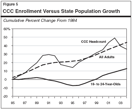 Figure 5 compares the cumulative change in enrollment over the past two decades with the cumulative change in the adult population, as well as the cumulative change in the traditional college-age population (18- to 24-year-olds). As the figure shows, CCC's enrollment has far outpaced the college-age population, and has generally matched growth in the adult population.