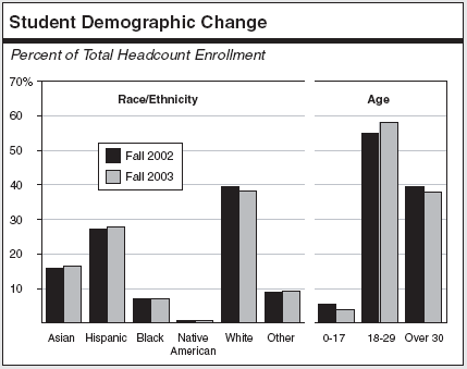 Little Enrollment Decline Using Full-Time Equivalent (FTE) Measure. While headcount is a useful indicator of "access" in that it measures the number of individuals receiving instruction, it does not accurately reflect the amount of instruction being provided. This is because headcount measures do not distinguish between a full-time student taking 30 units per year and a part-time student taking, say, 6 units per year. For instance, although student headcount dropped about 6.6 percent between fall 2002 and fall 2003, the number of total course "slots" that were taught declined by less than 2 percent. This suggests that, on average, the individual students making up the 6.6 percent headcount decline had been part-time students taking fewer than the average number of units. Indeed, anecdotal evidence suggests that many of these students were taking only one or two courses per semester.