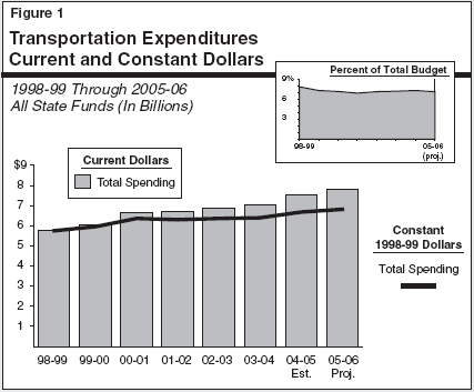Historical Trends. Figure 1 shows total state-funded transportation expenditures from 1998-99 through 2005-06 (after adjustments for the errors noted above). As the figure shows, over the period, these expenditures are projected to increase by $2.1 billion, or 36 percent. This represents an average annual increase of 4.5 percent. Figure 1 also displays the spending for transportation programs adjusted for inflation (constant dollars). On this basis, expenditures are estimated to increase by 19 percent from 1998-99 through 2005-06 at an average annual rate of 2.5 percent.