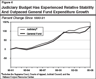 Judiciary Already Has Budget Stability and Independence. One of the key reasons given for the proposed expansion of the SAL funding methodology is the need for budget stability and independence. According to Administrative Office of the Courts (AOC) staff, using the SAL growth factor would ensure that the courts experience steady growth, and would prevent the courts from being subject to significant budget cuts during times of state fiscal crisis. However, our review of historical funding shows that the judiciary has, in fact, experienced relative budget stability. Figure�4 shows General Fund expenditures for the judiciary from 1990-91 through 2005-06. As the figure illustrates, the judiciary budget generally experienced steady upward growth during this period. In fact, our analysis shows that spending for the judiciary has been more stable than the General Fund and slightly outpaced growth in General Fund expenditures.