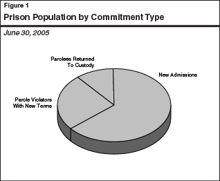 About 64�percent of the inmates are new admissions from the courts, 25�percent are offenders returned by the courts for a new offense while on parole status, and 11�percent are parolees returned to prison by administrative actions for violation of their conditions of parole (see Figure�1).