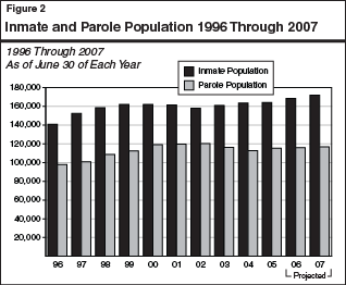 Inmate Population Increase. As of June 30, 2005, CDCR housed 164,179 inmates in prisons, fire and conservation camps, and community correctional facilities. The CDCR forecasts the inmate population will increase to 172,019 by June 30, 2007, a projected two year increase of 7,840 inmates, or about 5�percent, compared to the beginning of the current fiscal year. The state has not experienced a two-year increase in the prison population of this magnitude since the late 1990s. The projected increase in the inmate population is primarily the result of a recent trend of increasing admissions to prison from county courts. Figure�2 shows the year-end inmate and parole populations for the period 1996 through 2007.