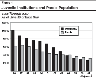 Juvenile Parole Population Decrease. As of June 30, 2005, CDCR supervised 3,650 youthful offenders on parole. The department forecasts the parole population will decrease to 3,175 by June 30, 2007, a projected two-year decrease of 475 parolees, or 13�percent. The projected decrease is the result of a continuing trend of declining admissions to youth correctional facilities. As Figure 1 shows, beginning in 2004, the parole population is slightly greater than the institution population and is projected to remain greater through 2007. This is primarily a result of (1) a declining rate of new admissions into DJJ youth correctional facilities and (2) an increasing average length of time that a ward is on parole.