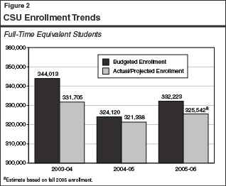 As shown in Figure 2, CSU has not met its budgeted enrollment targets in the previous two years (2003-04 and 2004-05). In other words, the state provided funding for more students than the university enrolled. Based on recent trends and preliminary data, CSU appears unlikely to meet its 2005-06 enrollment target as well.