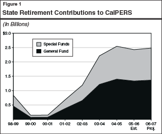 A Recent History of Volatile Contribution Rates. In The 2005-06 Budget: Perspectives and Issues (P&I), we discussed the issue of public pension benefits and costs. Among the issues discussed was the volatility of rates that public employers have been required to contribute to retirement systems, despite policies described above to reduce such fluctuations. After the bull market of the 1990s greatly improved the funding of pension systems, many systems reduced required employer contributions substantially. Figure�1 illustrates how the state�s required contributions to CalPERS� dropped to minimal amounts in 1999-00 and 2000-01. Other pension systems-throughout California and the nation-also reduced required contribution rates for public employers. At about the same time, the state and many local governments increased retirement benefits, which used up surplus assets and increased the annual normal cost of pension funding. When the stock markets declined, plans experienced consecutive years of less-than-expected investment returns. This double whammy-major asset losses and higher benefit costs-led to rapid increases in required employer contribution rates. Figure 1 shows how state contributions to CalPERS dramatically increased between 2001 and 2004.