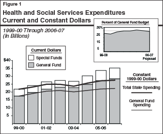 Budget Year. The budget proposes General Fund expenditures of $28.5�billion for health and social services programs in 2006-07, which is 29�percent of total proposed General Fund expenditures. Figure�1 shows health and social services spending from 1999-00 through 2006-07. The proposed General Fund budget for 2006-07 is $1.2�billion (4.5�percent) above estimated spending for 2005-06. Special funds spending for health and social services is proposed to increase by $267�million to about $6.7�billion.