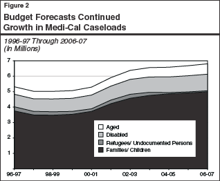 Medi-Cal Caseload. As shown in Figure�2, the Governor�s budget plan assumes that a modest increase in caseload will occur during the budget year in the Medi-Cal Program. Specifically, the overall caseload is expected to increase by about 127,000 average monthly eligibles (1.9�percent) to a total of about 6.8�million in 2006-07. This would be a slightly higher pace of growth than is projected for 2005-06. The caseload projections for 2006-07 take into account the Governor�s budget proposals discussed below to encourage eligible, but currently unenrolled, children to sign up for Medi-Cal, in part by simplifying the annual eligibility redetermination form. This change is expected to result in a caseload increase of 27,000. The Medi-Cal budget proposal also reflects continued growth in several eligibility categories, primarily aged and disabled beneficiaries and nonwelfare families.