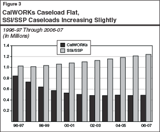 The CalWORKs and SSI/SSP Caseloads. Figure�3 shows the caseload trend for CalWORKs and SSI/SSP. While the number of cases in SSI/SSP is greater than in the CalWORKs program, both programs serve about 1.2�million persons. (The SSI/SSP cases are reported as individual persons, while CalWORKs cases are primarily families.)