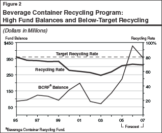In enacting the Bottle Bill, the Legislature sought to make redemption and recycling convenient, thereby encouraging litter abatement and beverage container recycling. The Legislature set a statutory recycling goal of 80�percent. When the recycling rate reaches around 80�percent, the BCRF essentially �clears� itself. That is, when consumers recycle 80�percent of purchased beverage containers subject to the CRV, all money paid into the fund by beverage container distributors is paid out either in reimbursements to beverage container recycling processors or to cover administrative and programmatic costs (including grants and public education). In other words, up to around an 80�percent recycling rate, the Beverage Container Recycling Program is totally self-financing. However, over the 20-year history of the program, the recycling rate has rarely reached 80�percent. For example, in 2004-the last year for which actual data are available-the recycling rate was 59�percent. As a result, a significant portion of the monies paid into the BCRF has remained in the fund. Given the available balances, the Legislature approved loans from the BCRF to the General Fund totaling $286.3�million to help cover a General Fund budget shortfall in 2002-03 and 2003-04. The amount of these loans plus interest-an estimated $320�million-is to be repaid to the BCRF in 2008-09. Were these loans not made, the actual fund balance would be even higher than it is today.