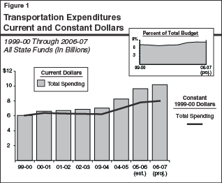Historical Trends. Figure�1 shows total state-funded transportation expenditures from 1999-00 through 2006-07. As the figure shows, over the period, these expenditures are projected to increase by $4�billion, or 66�percent. This represents an average annual increase of 7.8�percent. Figure�1 also displays the spending for transportation programs adjusted for inflation (constant dollars). On this basis, expenditures are estimated to increase by 32�percent from 1999-00 through 2006-07, at an average annual rate of 4�percent.