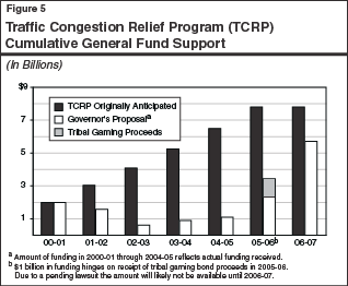 The TCRP. The TCRP is the second major project construction program. It mainly consists of 141 statutorily-defined projects located throughout the state, with each project receiving a specified amount of money. Collectively, these projects are to receive about $4.9�billion through 2007-08 from the General Fund and sales tax on gasoline. Through 2005-06 they will have received about $2.4�billion. (This amount assumes $1�billion in tribal gaming bond funds arrive in the current year which, as discussed later, is not likely to occur until the budget year.) Because TCRP does not provide full funding for all of the projects, many of them are funded from multiple sources, including STIP money.