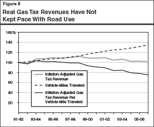 Gas Tax Revenues Have Not Kept Pace With Increasing Travel. The number of miles traveled on California roads has steadily increased over the past 15 years. As Figure�8 indicates, vehicle-miles traveled on all California roads are projected to increase 35�percent between 1991-92 and 2006-07. However, gas excise tax revenues, a major source of transportation funding in the state, have not kept pace with this trend. Figure�8 shows that this tax roughly kept pace with miles traveled through much of the 1990s, as the tax was gradually increased in that period from 9 cents to 18 cents per gallon. From 1998-99 through 2006-07, however, inflation-adjusted state gas tax revenues are projected to decline 8�percent while vehicle-miles traveled increase by more than 16�percent. (Gas tax rates are not adjusted for inflation. As a result, inflation erodes the purchasing power of the revenues over time.)