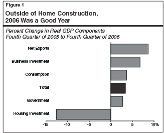 Figure 1 shows that most gross domestic product (GDP) categories experienced moderate to healthy growth in real (inflation-adjusted) terms on a fourth-quarter to fourth-quarter basis during the year. The one exception is residential construction—primarily housing—which fell sharply. Specifically: