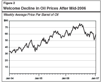 World crude oil prices, which rose from around $30 per barrel in early 2004 to a peak of over $75 in mid-2006, began falling in late summer. As shown in Figure 2, prices retreated from $73 in August to near $60 as of the close of 2006. Prices dropped further during the first three weeks of January, into the low $50s, before returning to about $60 as of mid-February.