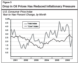 One of the major concerns in early 2006 was that the rise in energy prices was beginning to spill over into the rest of the economy. Businesses, no longer able to absorb higher energy costs, were starting to raise the prices of their products and services. Figure 3 shows that “core” inflation (as measured by the Consumer Price Index (CPI) excluding food and energy costs) was accelerating in early 2006, rising from a year-to-year monthly gain of 2.1 percent at the beginning of the year to 2.9 percent as of September. This raised concerns that the Federal Reserve would need to further raise interest rates in order to constrain the economy and thereby hold down inflation, potentially aggravating the economic slowdown that was already occurring.
