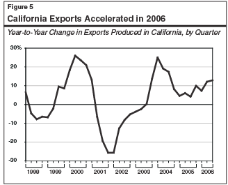 As shown in Figure 5, exports of goods produced in California accelerated in 2006, and were up about 13 percent in the third quarter of the year. The third-quarter growth reflected an over-30 percent increase in shipments to China, and more moderate, but still healthy, growth in shipments to other California trading partners.